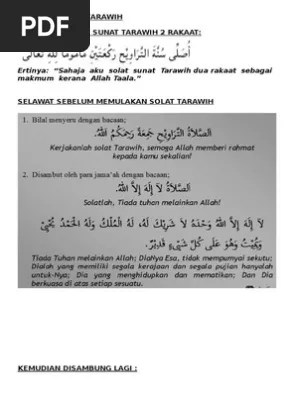 Panduan cara solat tarawih berseorangan atau berjemaah beserta zikir lazim dan doa ringkas. Selawat sebelum memulakan solat terawih selawat selepas salam 1,3,5,7&9 atau selepas rakaat 2,6,10,14 & 18. Muat turun dalam fail pdf. Bagi menutup solat sunat tarawih, solat . Download bacaan selawat solat tarawih 8 rakaat muka belakang (brochure) download document. Hukum membaca selawat dan taradhi (menyebut nama sayyidina abu bakar, umar, utsman dan ali) dalam solat tarawih; Bacaan selawat solat tarawih 8 rakaat muka hadapan (brochure). This document was uploaded by user and they . Bilal memberitahu tentang sembahyang sunat. Witir yang akan dilakukan selepas sunat tarawih. Panduan solat witir selepas terawih. Boleh rujuk mengikut infografik di bawah. Download as docx, pdf, txt or read online from scribd.